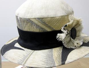 The first hat is rendered in the artist linen canvas, and frosted with a crushed hatband of Morris' pastel Art Nouveau print. The lining is a luxurious cream colored Italian dupioni silk.
